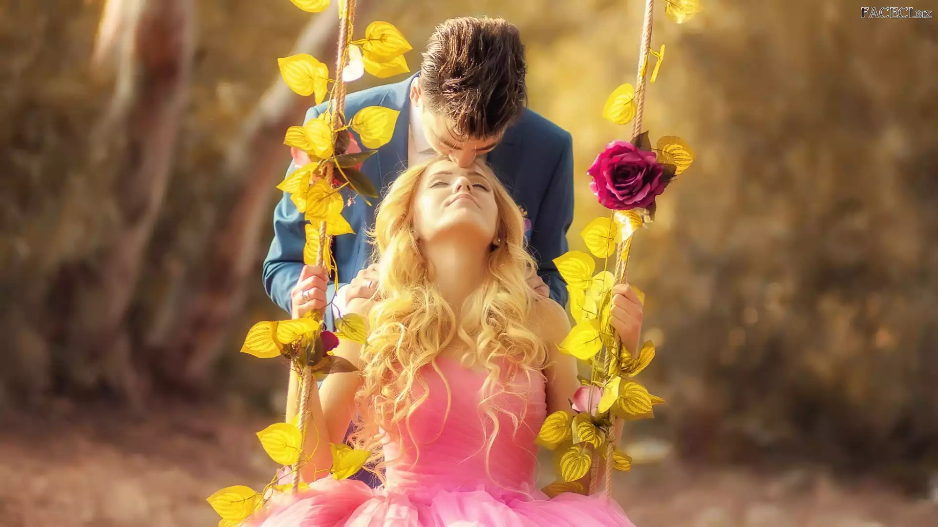 Róża, Mężczyzna, Para, Liście, Huśtawka, Kobieta, Zakochani, Miłość - faceci.biz